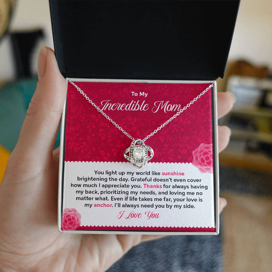 To my Incredible Mom - Gift From Daughter/Son In Law, Present For Mom Jewelry Gift Ideas For Mother's Day. Cute Mothers Day Love Knot Necklace From Son Daughter